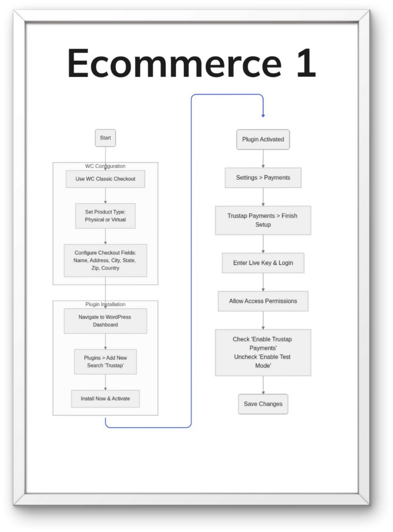 - Step-by-Step Logic: Visualizes critical configuration details like Use Classic Checkout, Set Product Type, and Enable Trustap Payments.